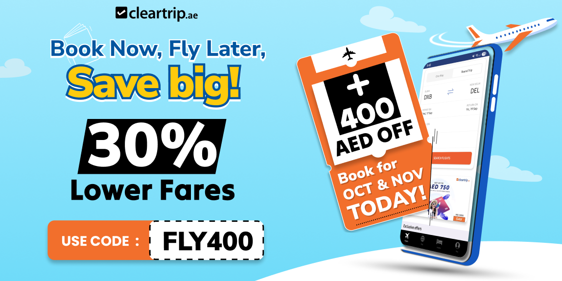 Why wait for prices to rise? Enjoy 30% lower fares and score additional 400 AED off flights when you book ahead for Oct or Nov. Use code FLY400 now.